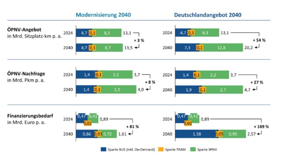Damit der Nahverkehr zuverlässig bleibt, braucht es laut VDV-Bericht zunächst eine Modernisierungsoffensive (Modernisierung 2040): instandgesetzte Infrastruktur, digitale Betriebsabläufe, klimafreundliche Fahrzeuge und robuste Werkstätten. Um dies zu erreichen, wäre bis zum Jahr 2040 eine deutlich höhere Finanzierung nötig, nämlich rund 46 Millionen Euro mehr pro Jahr. Ab 2040 dann wären jährlich rund 1,61 Milliarden Euro erforderlich – fast doppelt so viel wie heute. Dieses Szenario schafft vor allem Stabilität: pünktlichere Verbindungen, moderne Züge, eine leichte Nachfragesteigerung und die Basis dafür, überhaupt weiterzuwachsen.