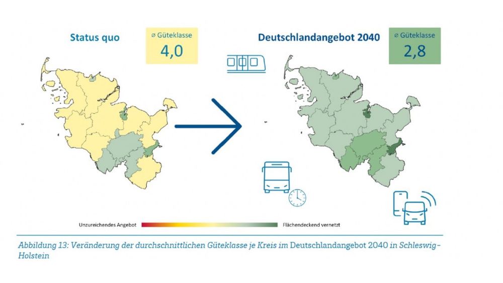 Grafik zur Veränderung der durchschnittlichen Güteklassen je Kreis im Deutschlandangebot 2040 in Schleswig-Holstein. Copyright: VDV - Verband Deutscher Verkehrsunternehmen